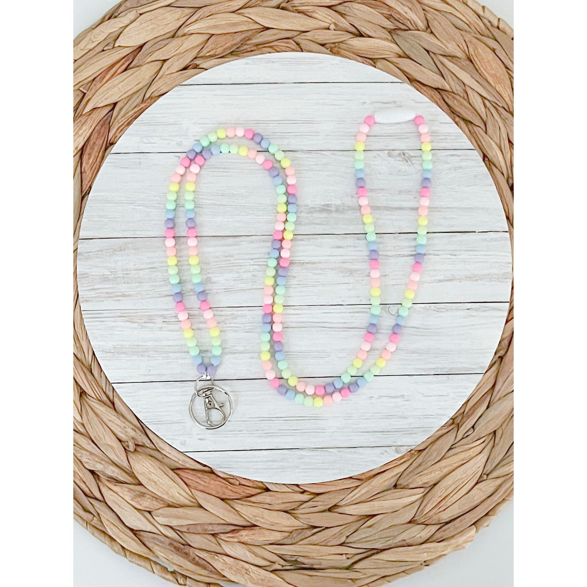 Our Lanyard is expertly handcrafted with high-quality glass beads in a mesmerizing array of pastel hues that seamlessly blend together to create a soft and captivating rainbow effect. Each lanyard features an easy-to-use clasp, allowing for effortless attachment and detachment of your keys, ID cards, or other important items.