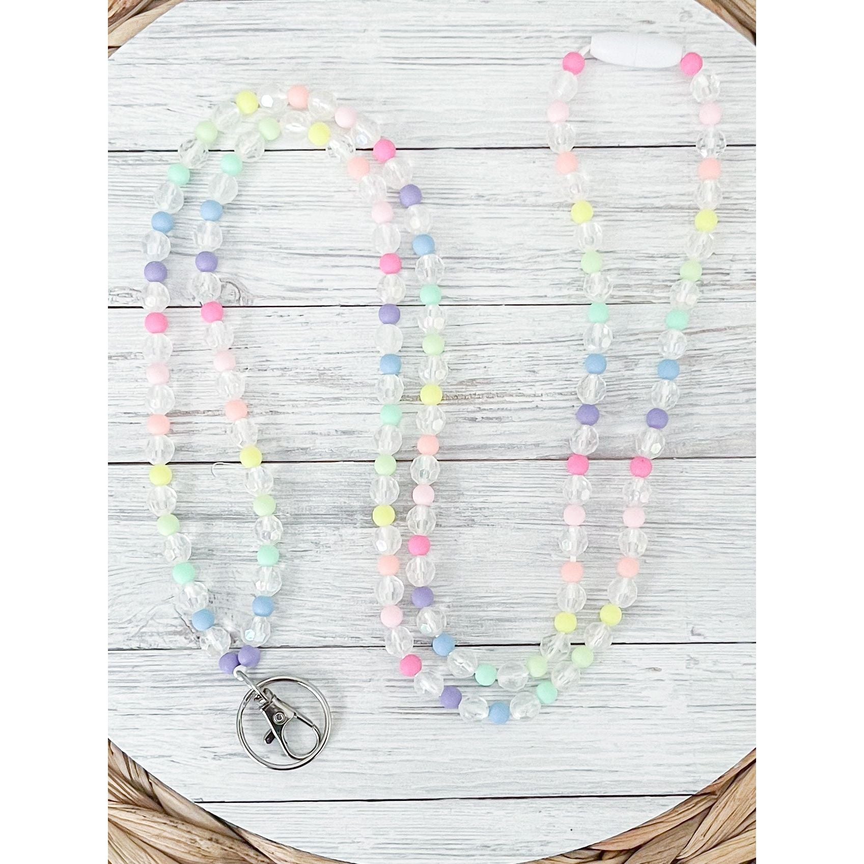 Our Lanyard is expertly handcrafted with high-quality glass beads in a mesmerizing array of pastel hues that seamlessly blend together to create a soft and captivating rainbow effect. Each lanyard features an easy-to-use clasp, allowing for effortless attachment and detachment of your keys, ID cards, or other important items.