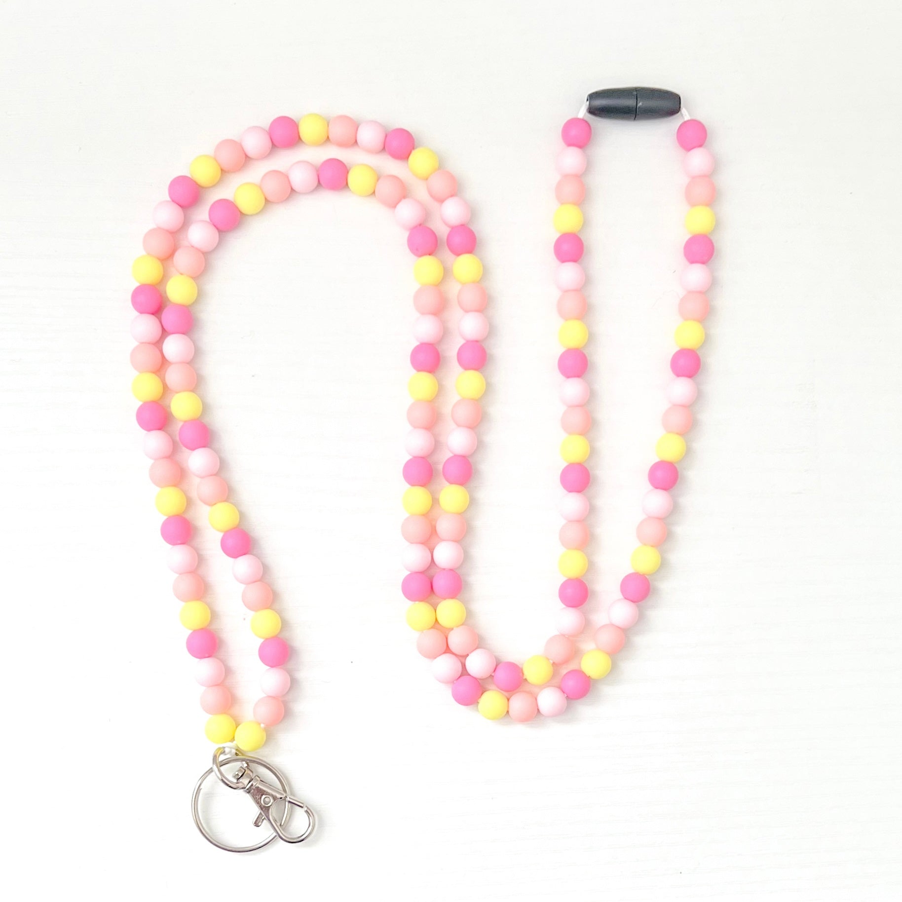 Our Lanyard is expertly handcrafted with high-quality glass beads in a mesmerizing array of pastel hues that seamlessly blend together to create a soft and captivating rainbow effect. Each lanyard features an easy-to-use clasp, allowing for effortless attachment and detachment of your keys, ID cards, or other important items.