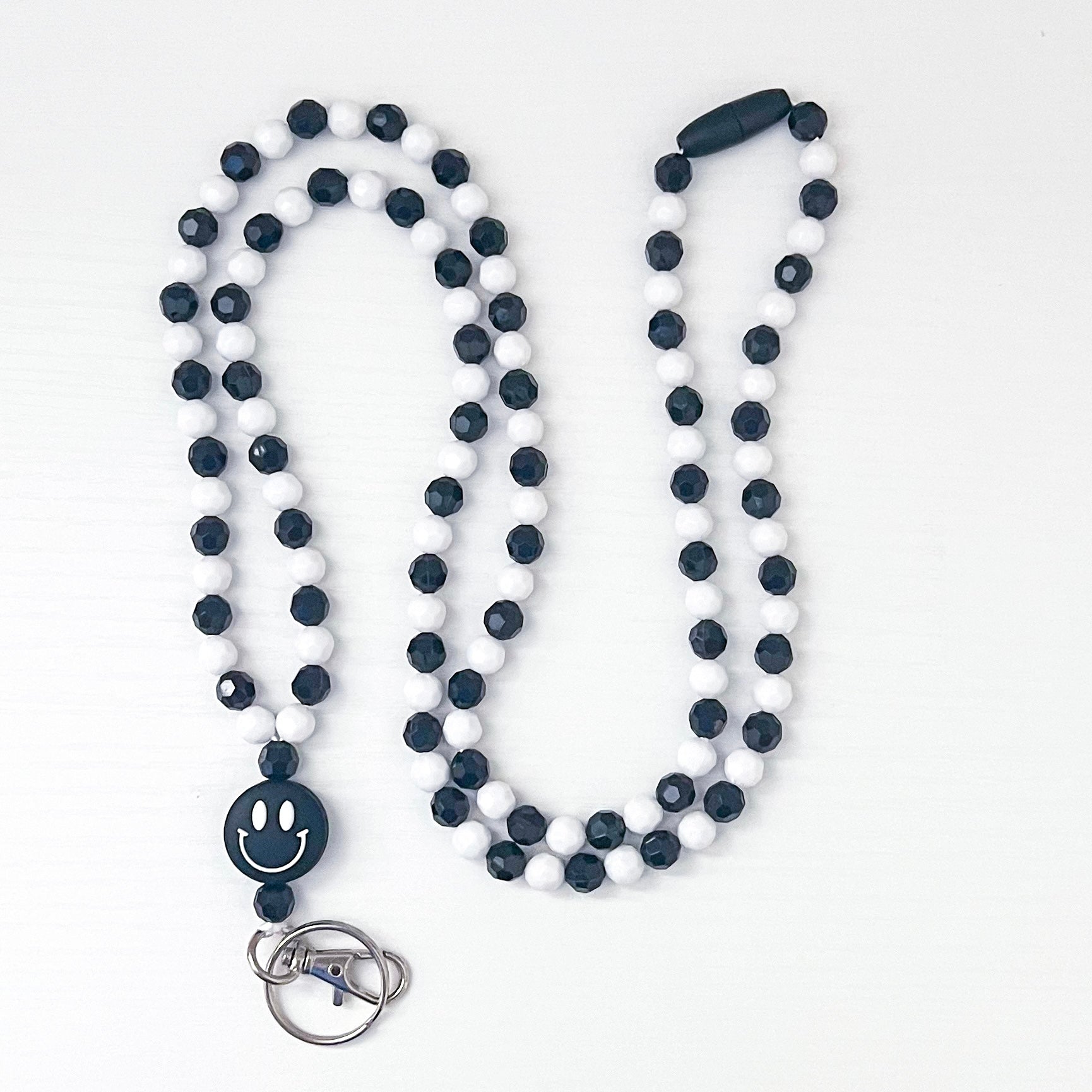 Introducing our Black and White Smile Beaded Lanyard - the perfect accessory to brighten up your everyday life while keeping your essentials securely at your fingertips.