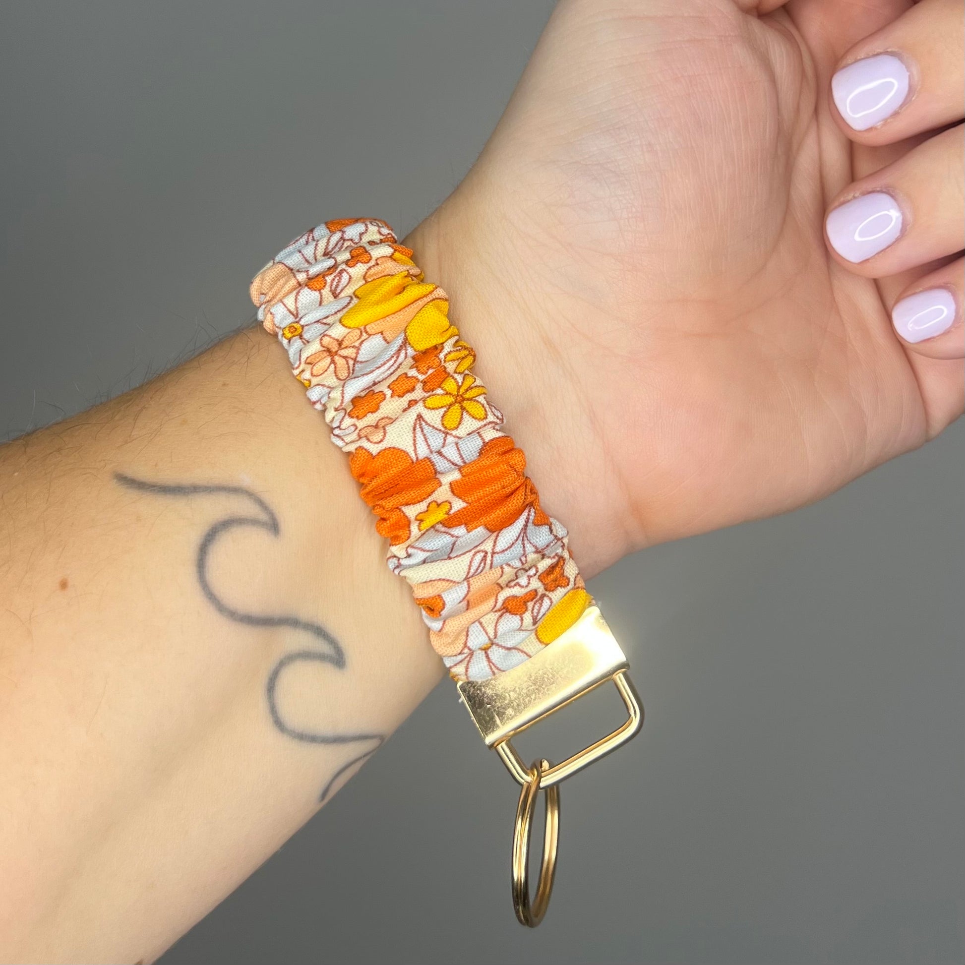 Groovy Orange Floral Scrunchie Wristlet Keychain