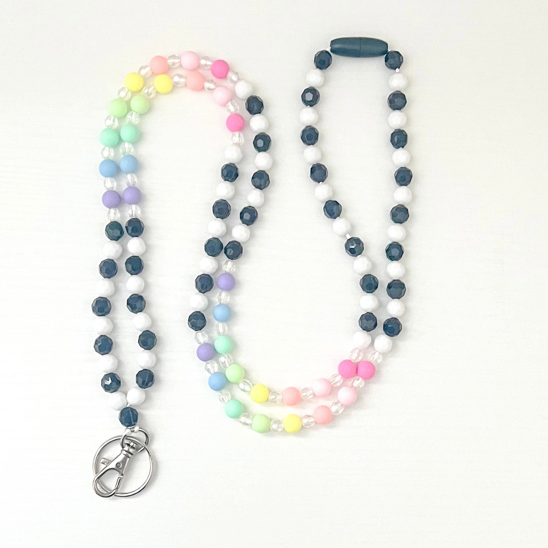 Introducing our Black, White and Rainbow Beaded Lanyard - the perfect accessory to brighten up your everyday life while keeping your essentials securely at your fingertips.