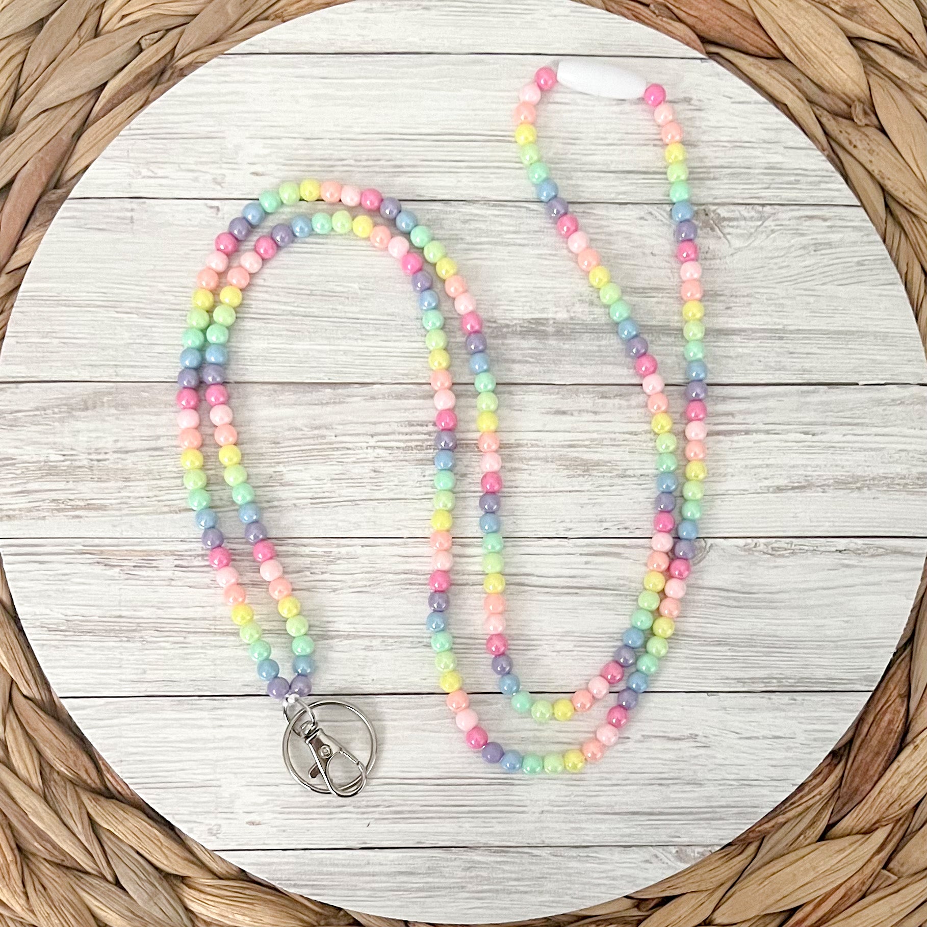 Our Lanyard is expertly handcrafted with high-quality glass beads in a mesmerizing array of pastel hues that seamlessly blend together to create a soft and captivating rainbow effect. Each lanyard features an easy-to-use clasp, allowing for effortless attachment and detachment of your keys, ID cards, or other important items.